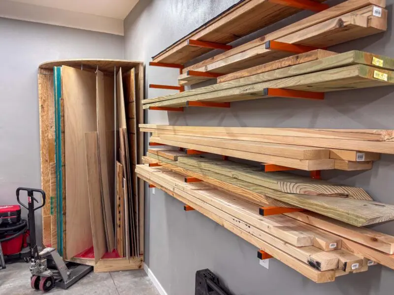 Don’t underestimate the value of installing material organizers back at the shop. You can buy solutions like Bora’s wood storage rack for smaller lumber and trim. You can also make your own solutions, like the sheet goods organizer we made for our shop.